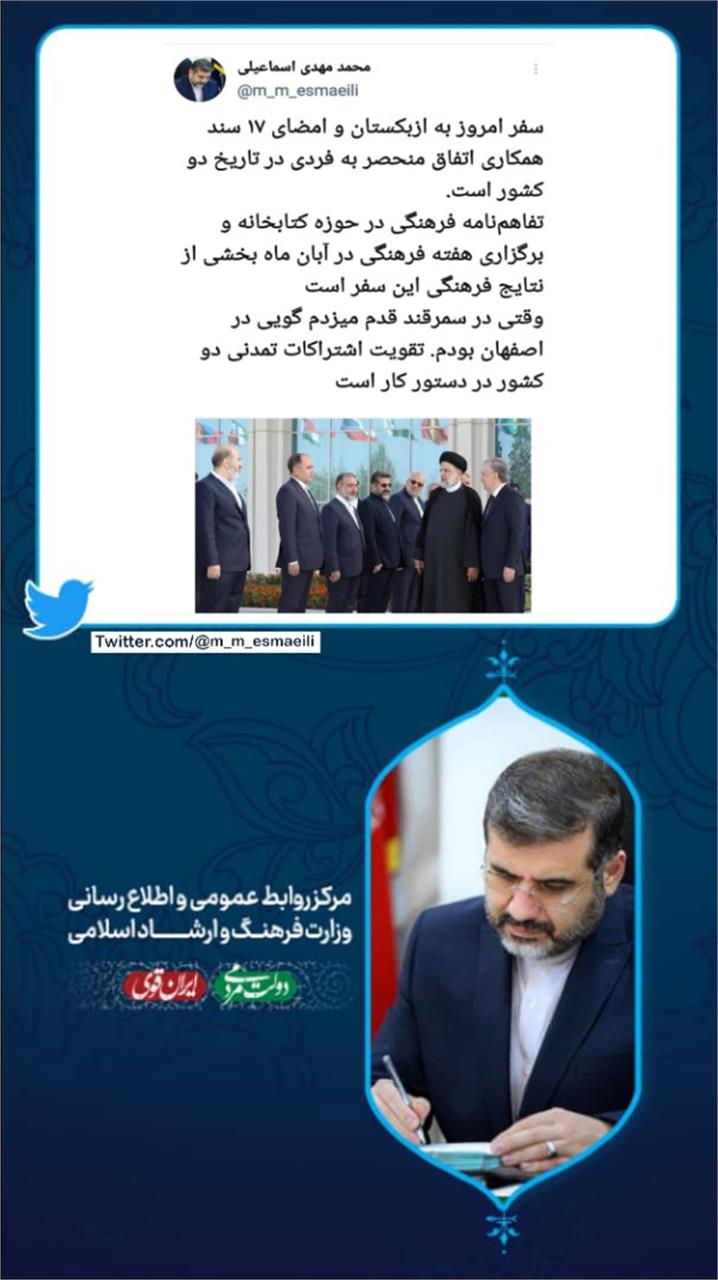 به گزارش مرکز روابط عمومی و اطلاعرسانی وزارت فرهنگ و ارشاد اسلامی، در نوشته محمدمهدی اسماعیلی در فضای مجازی آمده است: «سفر به ازبکستان و امضای ۱۷ سند همکاری اتفاق منحصر به فردی در تاریخ دو کشور است. تفاهمنامه فرهنگی در حوزه کتابخانه و برگزاری هفته فرهنگی در آبان ماه بخشی از نتایج فرهنگی این سفر است. وقتی در سمرقند قدم میزدم گویی در اصفهان بودم. تقویت اشتراکات تمدنی دو کشور در دستور کار است».