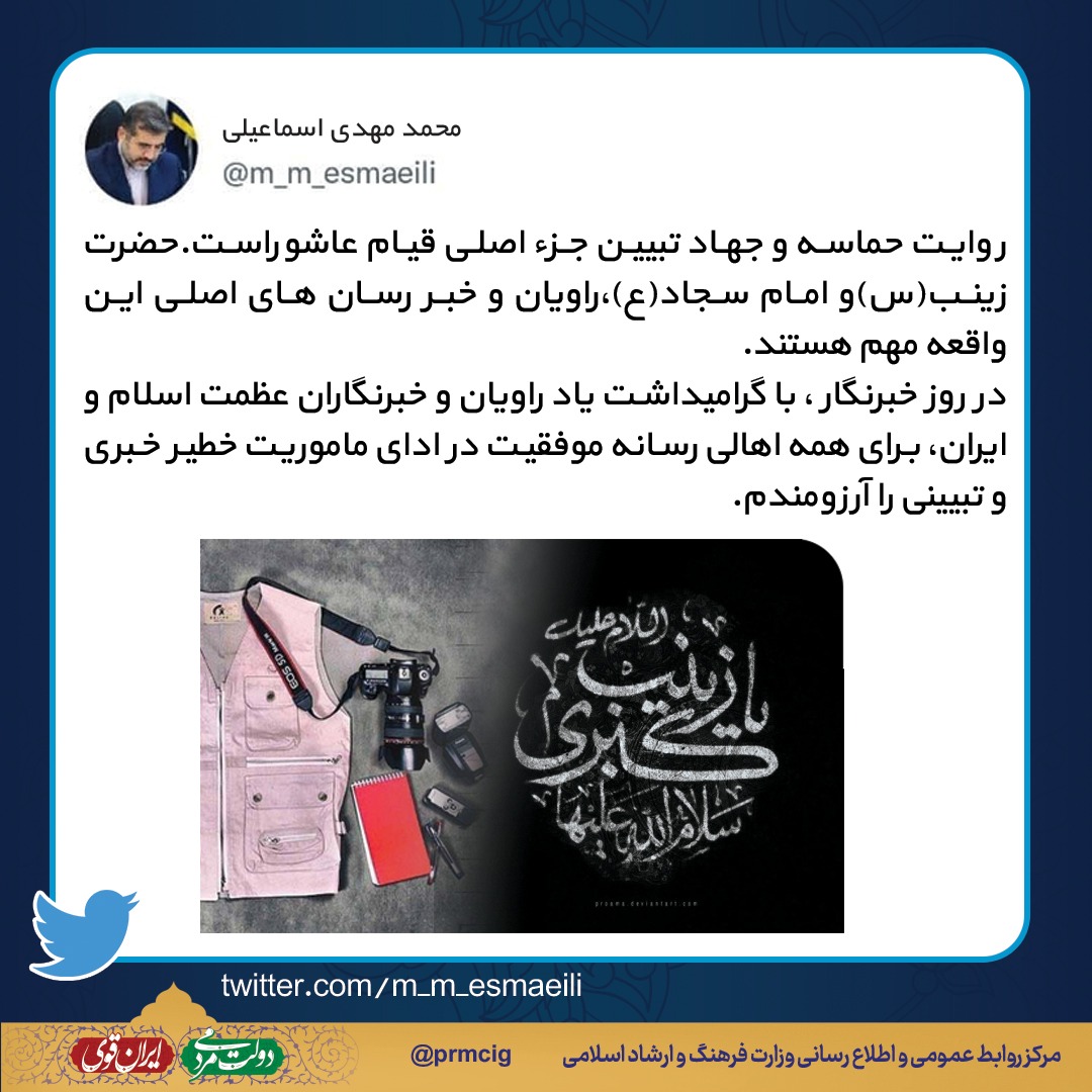به گزارش اقتصادروز و به نقل از  مرکز روابط عمومی و اطلاع‌رسانی وزارت فرهنگ و ارشاد اسلامی، در نوشته محمد مهدی اسماعیلی آمده است: «‏روایت حماسه و جهاد تبیین جزء اصلی قیام عاشوراست. حضرت زینب(س) و امام سجاد(ع)، راویان و خبر رسان های اصلی این واقعه مهم هستند.  در روز خبرنگار ، با گرامیداشت یاد راویان و خبرنگاران عظمت اسلام و ایران، برای همه اهالی رسانه موفقیت در ادای ماموریت خطیر خبری و تبیینی را آرزومندم.»