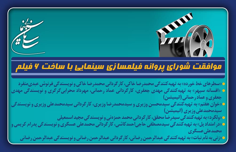 به گزارش ادارهکل روابط عمومی سازمان سینمایی، فیلمنامههای «سطرهای خط خورده» به تهیهکنندگی و کارگردانی محمدرضا خاکی و نویسندگی فرنوش عبدیمنفرد، «ولگرد» به تهیهکنندگی سیدرضا محقق، کارگردانی محمد حمزهئی و نویسندگی مجید اسمعیلی، «در امتداد پل» به تهیهکنندگی سیدمصطفی حاجیاحمدکاشی، کارگردانی محمدعلی عسگری و نویسندگی پدرام کریمی و محمدعلی عسگری، «زنی به نام نبات» به تهیهکنندگی، کارگردانی و نویسندگی عبدالرحمن رضائی، انیمیشنهای «افسانه سپهر» به تهیهکنندگی مهدی جعفری، کارگردانی عماد رحمانی و مهرداد محرابیگرگری و نویسندگی مهدی جعفری و عماد رحمانی و «خوان هفتم» به تهیهکنندگی سیدمحسن وزیری و سیدمحمدرضا وزیری و کارگردانی و نویسندگی سیدمحمدعلی وزیری موافقت شورای پروانه فیلمسازی سینمایی را اخذ کردند.