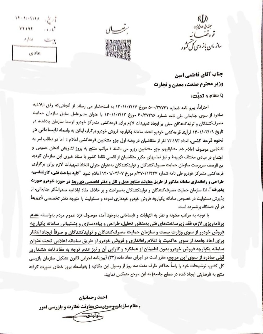 به گزارش اقتصادروز و به نقل از باشگاه خبرنگاران جوان سازمان بازرسی کل کشور به وزیر صمت، برای نابسامانی در سامانه یکپارچه فروش خودرو و نحوه قرعه‌کشی تذکر داد.