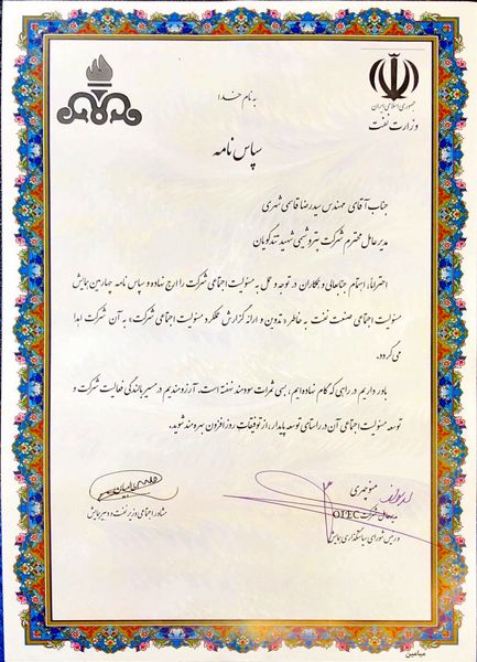 در متن این سپاس نامه که خطاب به مهندس سیدرضا قاسمی شهری مدیرعامل پتروشیمی شهید تندگویان میباشد ,آورده شده: