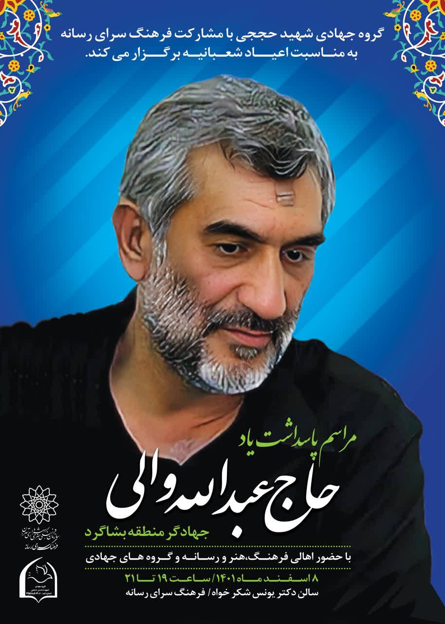 براساس این گزارش، مراسم گرامیداشت یاد و خاطره این جهادگر فقید، روز دوشنبه 8 اسفندماه از ساعت 19 الی 21 با حضور اهالی فرهنگ، هنر و رسانه، خانواده حاجعبدالله والی و جمعی از گروههای جهادی در سالن یونس شکرخواه فرهنگسرای رسانه برگزار میشود. از عموم علاقهمندان دعوت میشود در این مراسم حضور پیدا کنند.